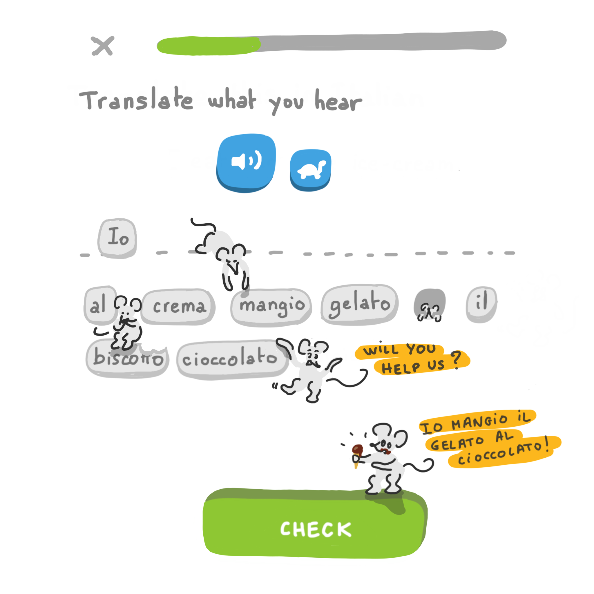 Image précédente Image suivante Duolingo-souris Dessin de l’interface Duolingo avec des souris qui crapahutent partout