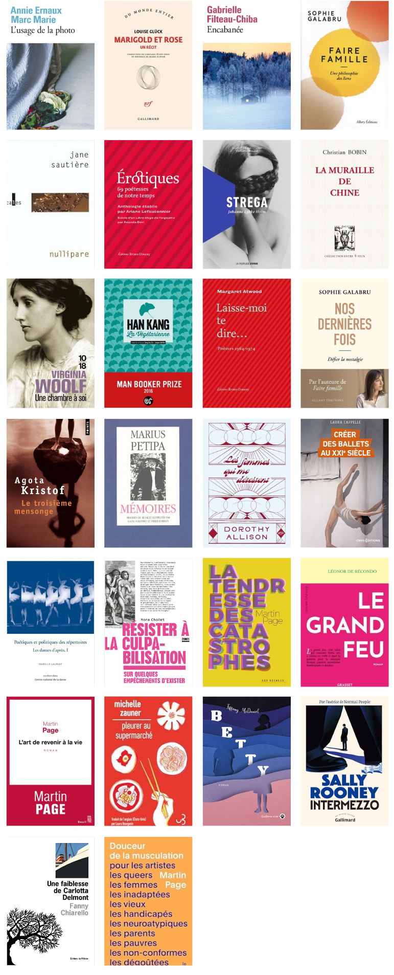 Janvier : Liv Maria de Julia Kerninon (2020) 💙💚 / La Femme aux mains qui parlent de Louise Mey (2024) / L’Appel des odeurs de Ryoko Sekiguchi (2024) / Les Ronces de Cécile Coulon / Bleuets de Maggie Nelson (2009) / Février : La Vie têtue de Juliette Rousseau (2022) / L’Animal céleste de Véra Pavlova (2004) / Fumées de Takuboku (1989) / Toucher la terre ferme de Julia Kerninon (2022) / Une activité respectable de Julia Kerninon (2017) / L’Analphabète d’Agota Kristof (2004) / Mars : Le Grand Cahier d’Agota Kristof (1986) 💛/ Tout ce qui nous était à venir de Jane Sautière (2024) / Nue, sous la lune de Violaine Bérot (2017) / Le Dernier Amour d’Attila Kiss de Julia Kerninon (2016) / Camille va aux anniversaires d’Isabelle Boissard (2024) / La Colère et l’Envie d’Alice Renard (2023) / La Preuve d’Agota Kristof (1988) / Fragments verticaux de Roberto Juarroz (1993) / L’empathie est politique de Samah Karaki (2024) / Avril : La Voyageuse de nuit de Laure Adler (2020) / De grandes dents, enquête sur un petit malentendu de Lucile Novat (2024) ❤️ / Chaos sur la toile de Kristín Marja Baldursdóttir (2007) 💛 / Mai : Veiller sur elle de Jean-Baptiste Andrea (2023) 💜 / L’Usage de la photo d’Annie Ernaux et Marc Marie (2005) / Marigold et Rose de Louise Glück (2022) / Encabanée de Gabrielle Filteau-Chiba (2018) / Faire famille, une philosophie du lien de Sophie Galabru (2023) / Nullipare de Jane Sautière (2008) / Érotiques, 69 poétesses de notre temps (2024) / Strega de Johane Lykke Holm (2022) / La Muraille de Chine de Christian Bobin (2019) / Juin : Une chambre à soi de Virginia Woolf (1929) / La Végétarienne de Han Kang (2007) / Laisse-moi te dire… de Margaret Atwood (2020) / Nos dernières fois, Défier la nostalgie de Sophie Galabru (2025) / Juillet : Le Troisième Mensonge d’Agota Kristof (1991) / Mémoires de Marius Petipa / Les femmes qui me détestent de Dorothy Allison (1983-1991, 2024) / Hier d’Agota Kristof (1995) / Créer des ballets au XXIe siècle de Laura Cappelle (2024) / Août : Poétiques et politiques du répertoire, Les Danses d’après I d’Isabelle Launay 💛 / Septembre : Résister à la culpabilisation de Mona Chollet / La Tendresse des catastrophes de Martin Page (2025) 💛 / Le Grand Feu de Léonore de Récondo (2023) / Octobre : L’Art de revenir à la vie de Martin Page (2016) / Pleurer au supermarché de Michelle Zauner (2021) / Betty de Tiffany McDaniel (2020) 💙 / Novembre-décembre : Intermezzo de Sally Rooney (2024) 💙 / Décembre : Une faiblesse de Carlotta Delmont de Fanny Chiarello (2013) / Douceur de la musculation de Martin Page (2025) /